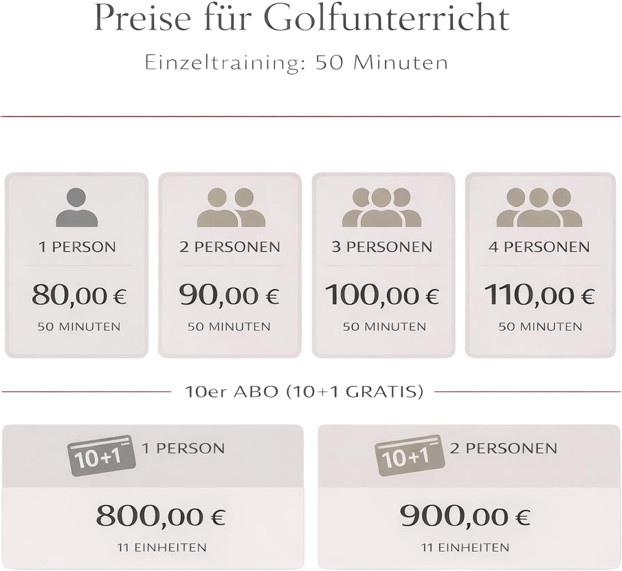 Die Leistungen unserer Trainingseinheiten beinhalten sämtliche Bälle, die Sie in der Unterrichtseinheit benötigen, das Range-Fee sowie die Benutzung aller uns zur Verfügung stehenden technischen Einrichtungen.